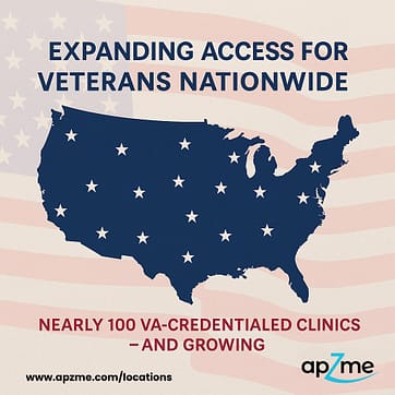 apZme’s credentialed clinics are supported through clinical education, billing, and VA coordination. Together with its partners, apZme is building a network focused on patient and long-term health.
